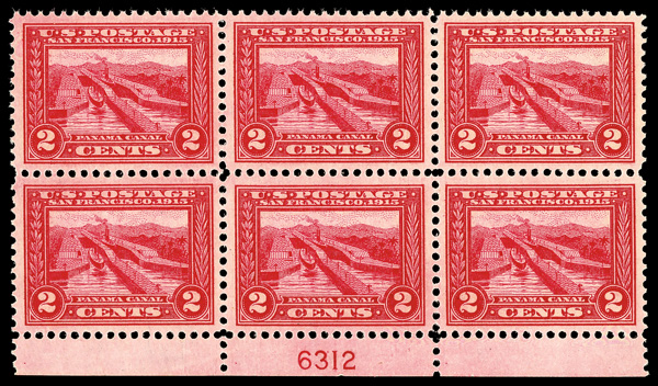 6584 nhbl 398 image1913, 2¢ Panama-Pacific, perf. 12 (Scott 398), bottom margin plate block of 6 with plate number 6312, Fresh, glowing surface appeal, o.g., never hinged, Fine to Very Fine.
