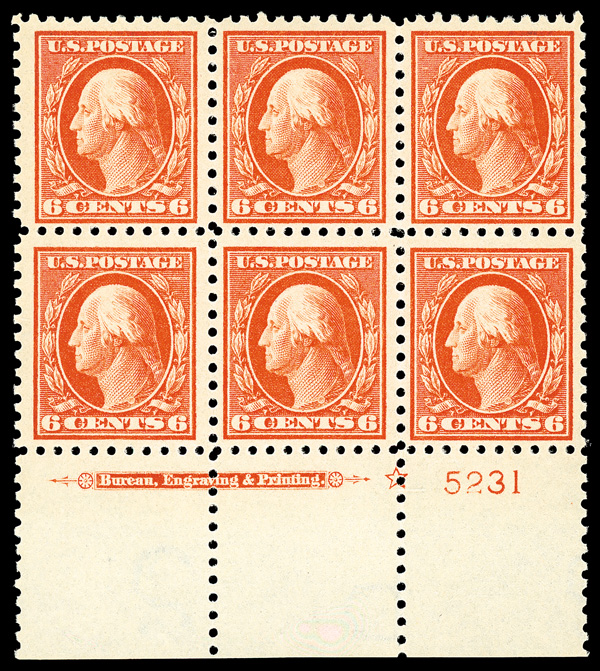 6591 nhbl 429 image1914, 6¢ red orange, S.L. watermark, perf. 10 (Scott 429), wide bottom margin plate block of 6 with star and plate number 5231, Freshly preserved color balance, o.g., never hinged; ink date hand stamp on the gum of three stamps, Very Fine.