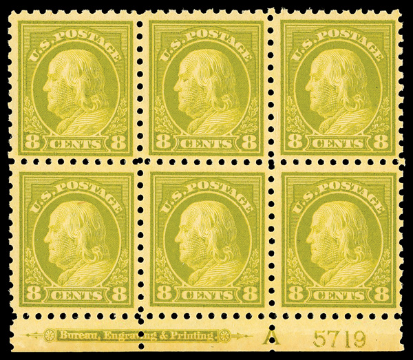 6592 nhbl 431 image1914, 8¢ pale olive green, S.L. watermark, perf. 10 (Scott 431), bottom margin plate block of 6 with imprint, A and plate number 5719, Radiant printing with freshness, o.g., never hinged, Fine to Very Fine.