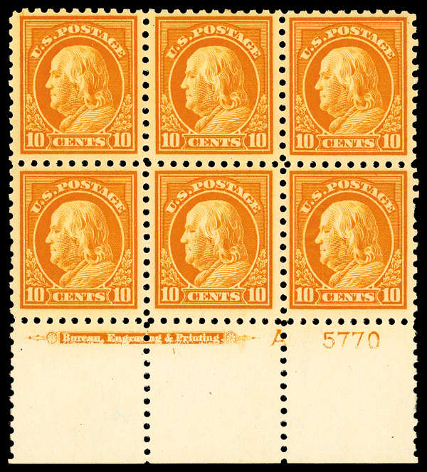 6593 ogbl 433 image1914, 10¢ orange yellow, S.L. watermark, perf. 10 (Scott 433), bottom margin plate block of 6 with imprint, A and plate number 5770, Deep shade beautifully preserved, o.g., previously hinged; blind perf at right, nearly Very Fine.