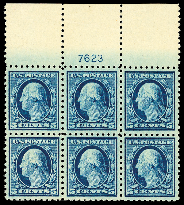 6596 nh/ogbl 466 image1916, 5¢ blue, unwatermarked, perf. 10 (Scott 466), wide top margin plate block of 6 with plate number 7623, Vibrant tone with striking clarity, several very well centered stamps at top, o.g., previously hinged (3 stamps never hinged); small thin on bottom center stamp, diagonal selvage crease, Very Fine.