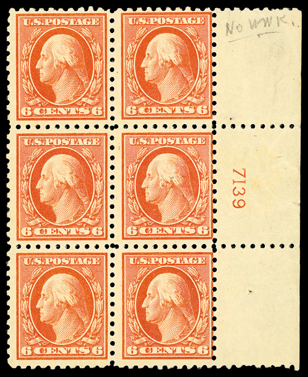 6598 ogbl 468 image1916, 6¢ red orange, unwatermarked, perf. 10 (Scott 468), right margin plate block of 6 with plate number 7139, Brightly struck with rich inking, disturbed o.g.; a couple light selvage bends, touching to Fine to Very Fine.