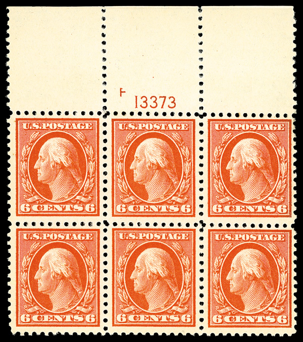 6609 nhbl 506 image1917, 6¢ red orange, perf. 11 (Scott 506), wide top margin plate block of 6 with plate number F 13373, Luminous tone showing fine detail, o.g., never hinged, Fine to Very Fine.
