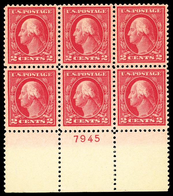 6606 nhbl 499 image1917, 2¢ rose, type I, perf. 11 (Scott 499), wide bottom margin plate block of 6 with plate number 7945, Clean surface with glowing hue, o.g., never hinged, Very Fine.