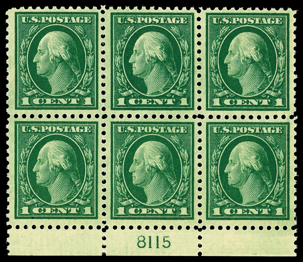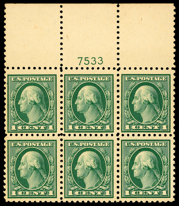 6589 ogbl 424 image1914, 1¢ green, S.L. watermark, perf. 10 (Scott 424), wide top margin plate block of 6 with plate number 7533, Fresh color, beautifully preserved, o.g., previously hinged, Very Fine.
