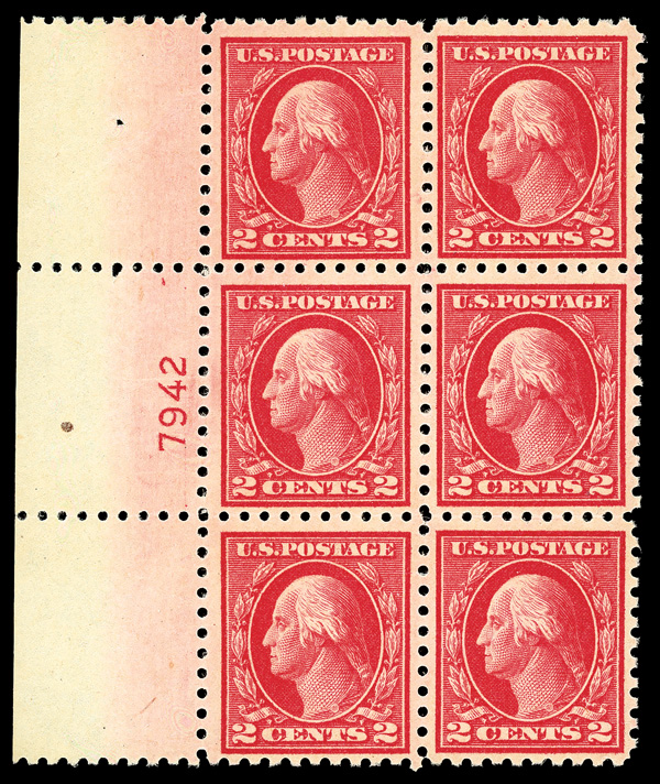 6597 nhbl 467 image1916, 2¢ carmine, unwatermarked, perf. 10 (Scott 467(463)), left margin plate block of 6 with plate number 7942, Rare plate number from the 5¢ error pane, o.g., never hinged; inclusion on center selvage, Fine to Very Fine.