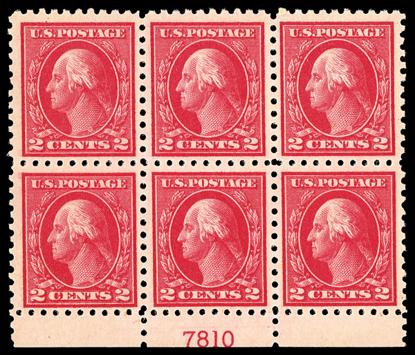 6595 nhbl 463 image1916, 2¢ carmine, type I, unwatermarked, perf. 10 (Scott 463), bottom margin plate block of 6 with plate number 7810, Radiant tone, sharp and clear, o.g., never hinged, Fine to Very Fine.