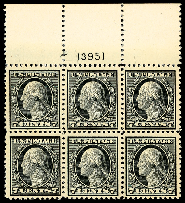 6610 nhbl 507 image1917, 7¢ black, perf. 11 (Scott 507), wide top margin plate block of 6 with plate number F 13951, Freshly preserved ink brilliance, o.g., never hinged, nearly Very Fine.
