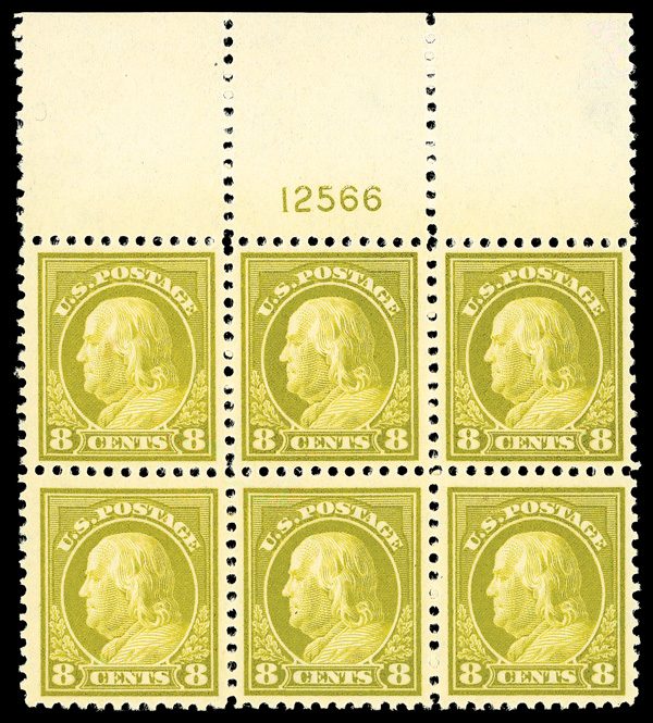 6611 nhbl 508 image1917, 8¢ olive bister, perf. 11 (Scott 508), wide top margin plate block of 6 with plate number 12566, Clean surface with glowing hue, o.g., never hinged, Very Fine.