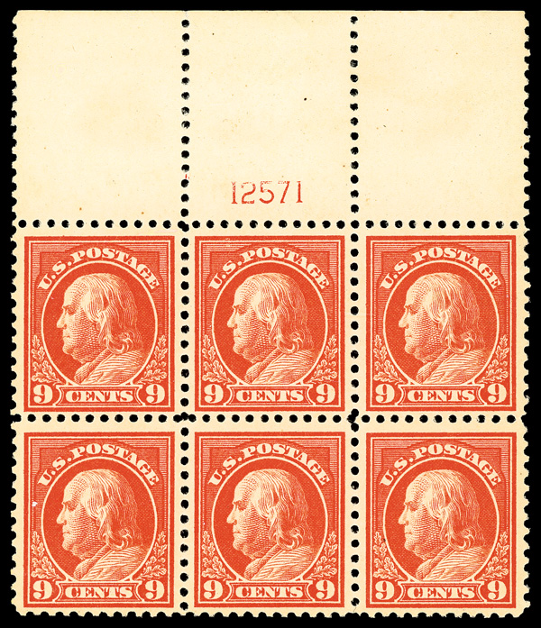 6612 nhbl 509 image1917, 9¢ salmon red, perf. 11 (Scott 509), wide top margin plate block of 6 with plate number 12571, Brilliant early color intensity, o.g., never hinged, overall Very Fine.