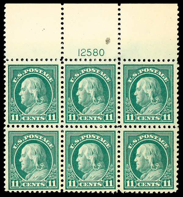 6613 nhbl 511 image1917, 11¢ light green, perf. 11 (Scott 511), wide top margin plate block of 6 with plate number 12580, Deep pigment with lasting vibrancy, o.g., never hinged; small gum disturbance on lower right stamp, inclusion on center selvage, Fine to Very Fine.