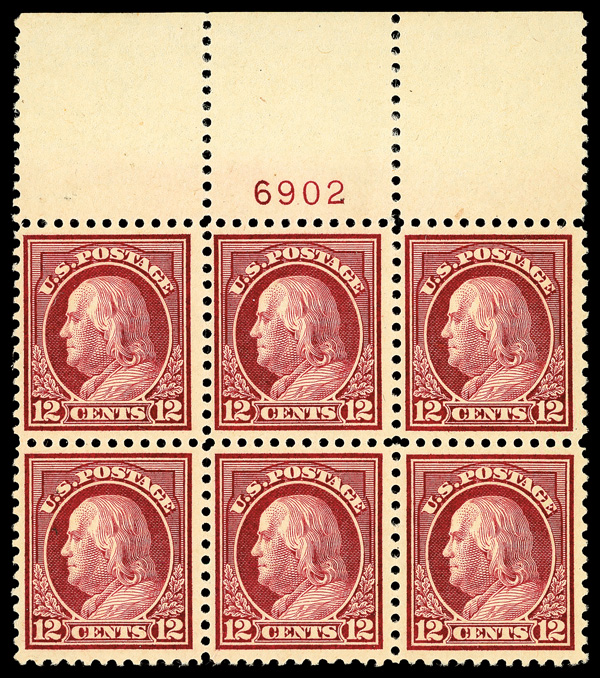 6614 nhbl 512 image1917, 12¢ claret brown, perf. 11 (Scott 512), wide top margin plate block of 6 with plate number 6902, Bright impression with rich depth, o.g., never hinged, Fine.