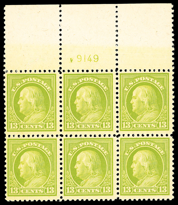 6615 nhbl 513 image1919, 13¢ apple green, perf. 11 (Scott 513), wide top margin plate block of 6 with plate number F 9149, Fresh color glowing with clarity, o.g., never hinged, Fine to Very Fine.