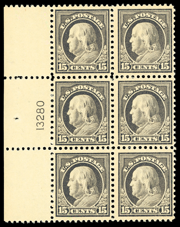 6616 nhbl 514 image1917, 15¢ gray, perf. 11 (Scott 514), left margin plate block of 6 with plate number 13280, Vivid hue with luminous quality, o.g., never hinged, Fine to Very Fine.