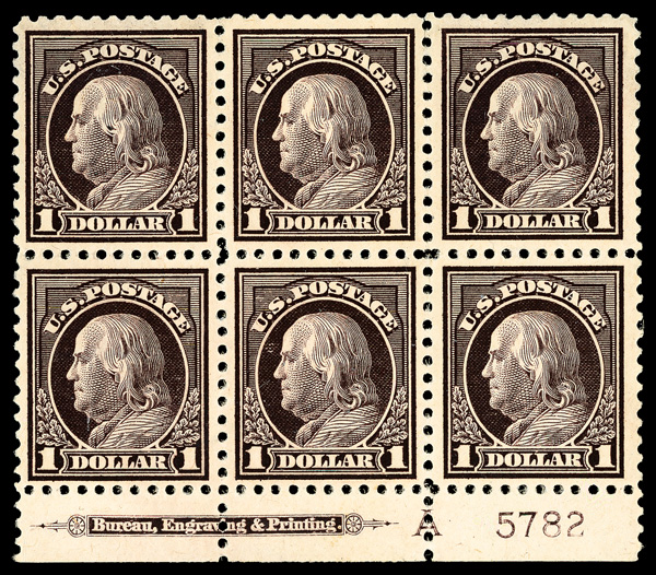 6617 ngbl 518 image1917, $1 violet brown, perf. 11 (Scott 518), bottom margin plate block of 6 with letter A and plate number 5782, Bright and crisp visual appeal, expertly regummed, Very Fine.
