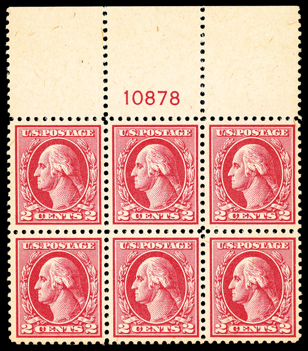 6600 nhbl 482 image1916, 2¢ carmine, type I, unwatermarked, imperf. (Scott 482), wide top margin plate block of 6 with plate number F 10313, enormous margins all around, o.g., never hinged, Superb.