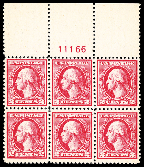 6620 nhbl 527 image1918, 2¢ carmine, type V, offset printing (Scott 527), wide top margin plate block of 6 with plate number 11166, Fresh radiant look throughout, o.g., never hinged, Fine to Very Fine.
