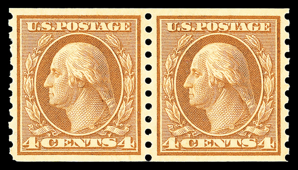 6604 nh 495 image1917, 4¢ orange brown, unwatermarked, rotary press coil, perf. 10 vertically (Scott 495), pair, o.g., never hinged, fresh and sound with warm, rich color and exceptional centering, Extremely Fine to Superb, with photocopy of 2006 P.S.E. certificate graded XF-SUP 95.
