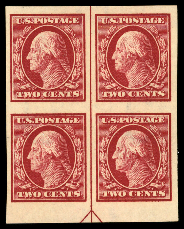 6582 nhbl 384 image1911, 2¢ carmine, S.L. watermark, imperf. (Scott 384), arrow block of 4, o.g., never hinged, Very Fine.