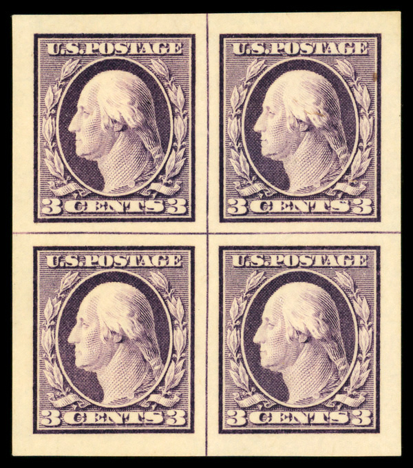 6603 nhbl 484 image1916, 3¢ violet, type II, unwatermarked, imperf. (Scott 484), arrow block of 4, o.g., never hinged, Extremely Fine.