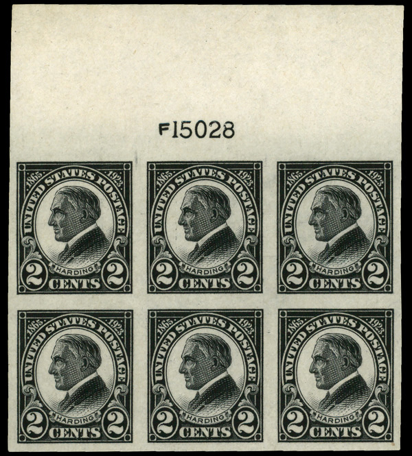 6684 nh/ogbl 611 image1923, 2¢ Harding, imperf. (Scott 611), top margin plate block of 6 with plate number 15028, Deep crisp tone with purity, o.g., bottom center stamp lightly hinged (5 stamps never hinged), Superb centering.
