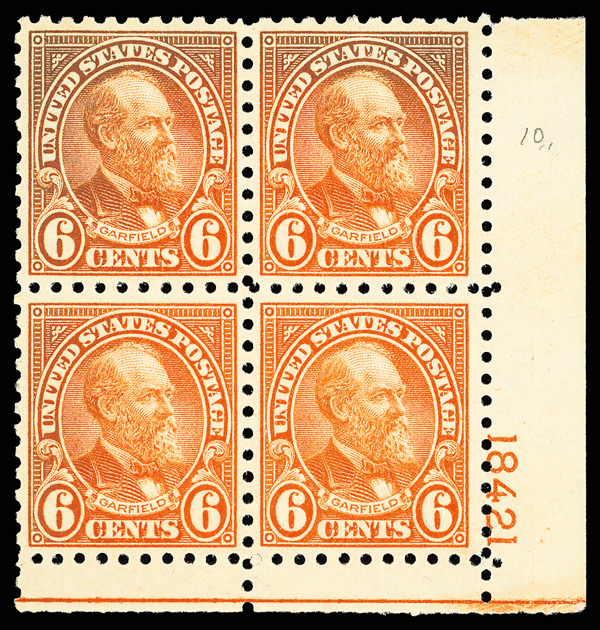 6680 nhbl 587 image1925, 6¢ Garfield, rotary press printing, perf. 10 (Scott 587), bottom right plate number 18421 block of 4, o.g., never hinged, sound and wonderfully centered; all but bottom right stamp partly oxidized, otherwise Very Fine.