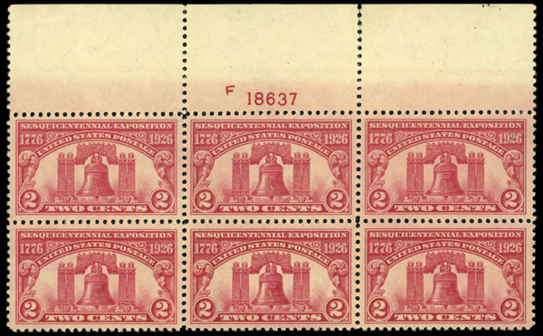 6696 nhbl 627 image1926, 2¢ Sesquicentennial Exposition (Scott 627), plate block of 6, o.g., never hinged, Extremely Fine.