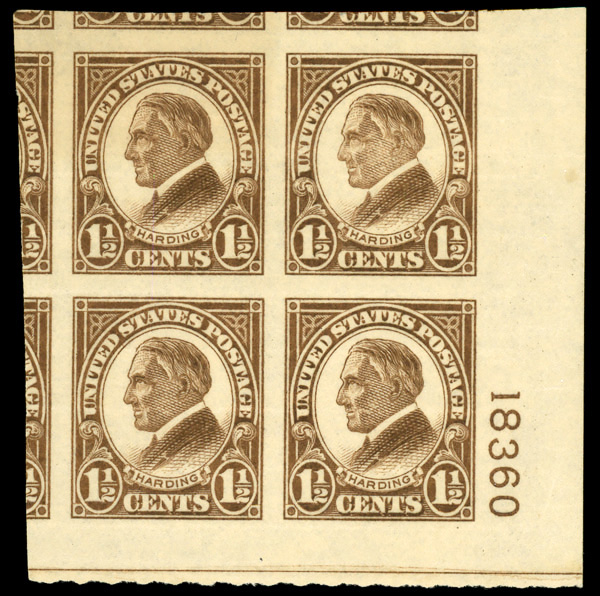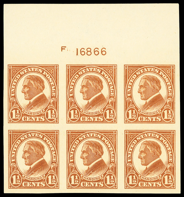 6671 nhbl 576 image1925, 1½¢ Harding, imperf. (Scott 576), wide top margin plate block of 6 with plate number F 16866, Fresh vivid saturation across the surface, o.g., never hinged, Very Fine to Extremely Fine.