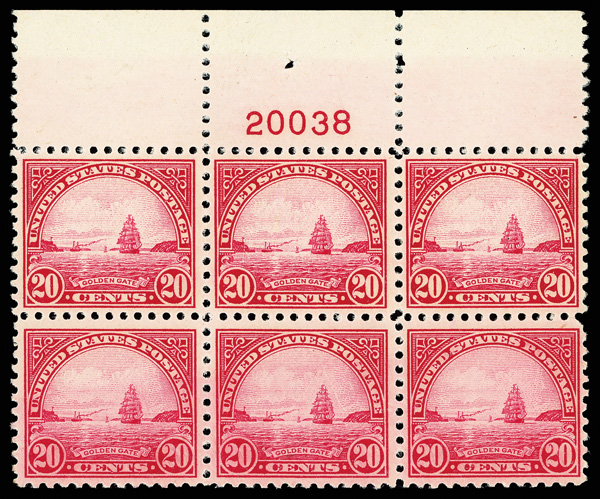 6661 nhbl 567 image1923, 20¢ Golden Gate (Scott 567), wide top margin plate block of 6 with plate number 20038, Bright luminous color retention, o.g., never hinged; minor gum skips, Fine to Very Fine.