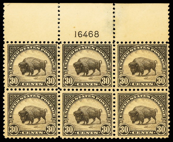 6664 nhbl 569 image1923, 30¢ American Buffalo (Scott 569), top margin plate block of 6 with plate number 16468, Bright evenly distributed hue, o.g., never hinged; minor perf separations at top, slight toning, Fine.