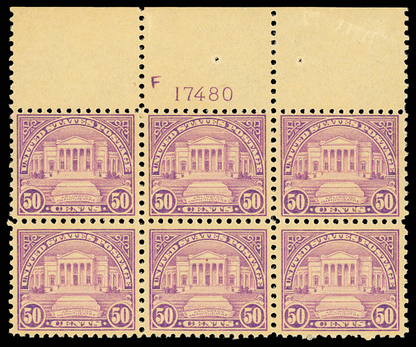 6665 nhbl 570 image1922, 50¢ Arlington Amphitheater (Scott 570), wide top margin plate block of 6 with plate number F 17480, Strong printed color purity, o.g., never hinged; slight toning, Fine to Very Fine.