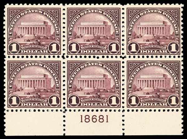 6666 nhbl 571 image1923, $1 Lincoln Memorial (Scott 571), bottom margin plate block of 6 with plate number 18681, Clean bright ink application, o.g., never hinged; minor gum skips, Fine to Very Fine.