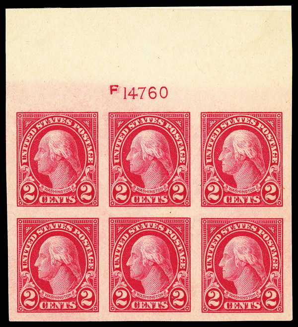 6672 nhbl 577 image1923, 2¢ Washington, imperf. (Scott 577), wide top margin plate block of 6 with plate number F 14760, Bright tone with lively brilliance, o.g., never hinged, Very Fine to Extremely Fine.