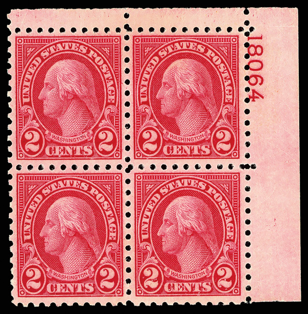 6676 nhbl 583 image1924, 2¢ Washington, rotary press printing, perf. 10 (Scott 583), top right plate block of 4 with plate number 18064, Vivid hue with crisp definition, o.g., never hinged, Very Fine to Extremely Fine.