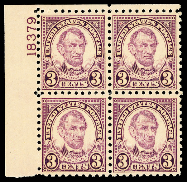 6677 nhbl 584 image1925, 3¢ Lincoln, rotary press printing, perf. 10 (Scott 584), top left plate block of 4 with plate number 18379, Bright pigmentation perfectly retained, o.g., never hinged, Fine to Very Fine.