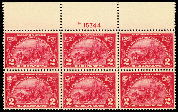 6686 nhbl 615 image1924, 2¢ Huguenot-Walloon (Scott 615), top margin plate block of 6 with plate number F 15744, Deep hue with luminous appeal, o.g., never hinged, Very Fine.