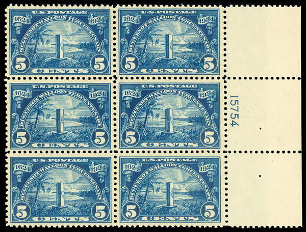 6687 nhbl 616 image1924, 5¢ Huguenot-Walloon (Scott 616), wide right margin plate block of 6 with plate number 15754, Crisp striking tone throughout, o.g., never hinged, Very Fine.