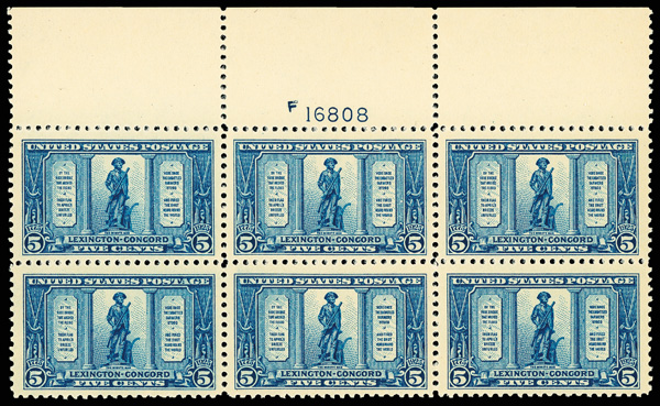6691 nhbl 619 image1925, 5¢ Lexington-Concord (Scott 619), wide top margin plate block of 6 with plate number F 16808, Fresh pigment with sharp detail, o.g., never hinged, Very Fine.
