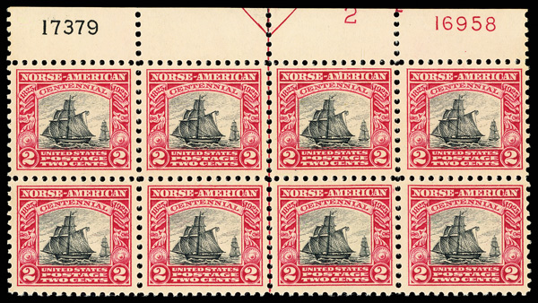 6692 nhbl 620 image1925, 2¢ Norse-American (Scott 620), top margin plate block of 8 with plate numbers 17379 and F 16958, Vivid printed color strength, o.g., never hinged, Very Fine.