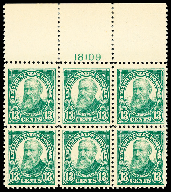 6694 nhbl 622 image1926, 13¢ Harrison (Scott 622), wide top margin plate block of 6 with plate number 18109, Fresh crisp color vibrance, o.g., never hinged, Very Fine.