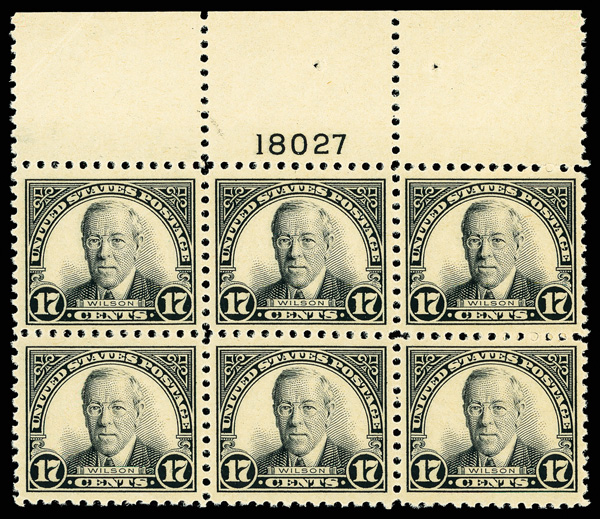 6695 nhbl 623 image1925, 17¢ Wilson (Scott 623), wide top margin plate block of 6 with plate number 18027, Bright, well-struck impression, o.g., never hinged; light bends on selvage, Very Fine.