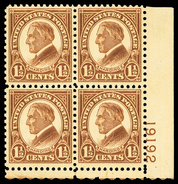 6675 nhbl 582 image1925, 1½¢ Harding, rotary press printing, perf. 10 (Scott 582), top right plate block of 4 with plate number 16851, Fresh crisp impression quality, o.g., never hinged, Fine to Very Fine.