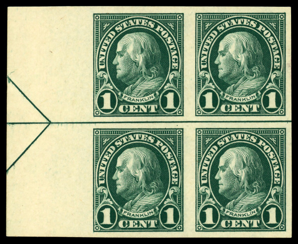 6670 nhbl 575 image1923, 1¢ Franklin, imperf. (Scott 575), arrow block of 4, o.g., never hinged, Very Fine to Extremely Fine.