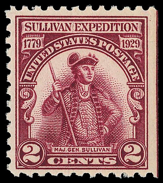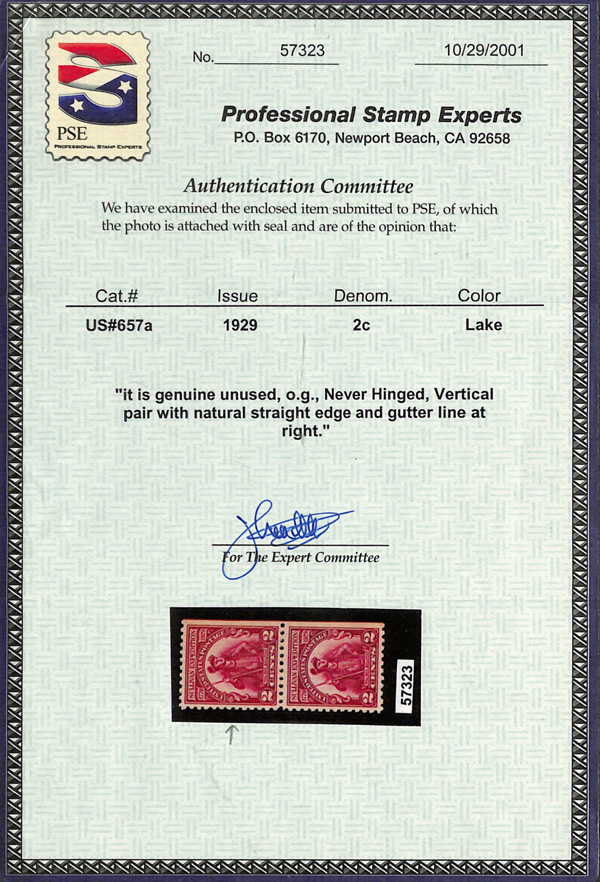 6707 nh 657a image1929, 2¢ Sullivan Expedition, lake color error (Scott 657a), right margin single with guide line, o.g., never hinged, Fine to Very Fine, with 2001 P.S.E. certificate for pair.