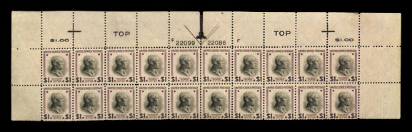 6739 nhbl 832 image1938, Presidential Issue, $1 Wilson (Scott 832), plate block of 20 with arrow, o.g., never hinged, Very Fine to Extremely Fine.