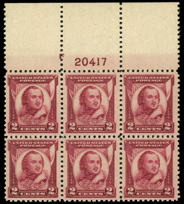 6728 nhbl 690 image1931, 2¢ Pulaski (Scott 690), top margin F plate block of 6, Fresh vibrant ink, o.g., never hinged, Very Fine to Extremely Fine.