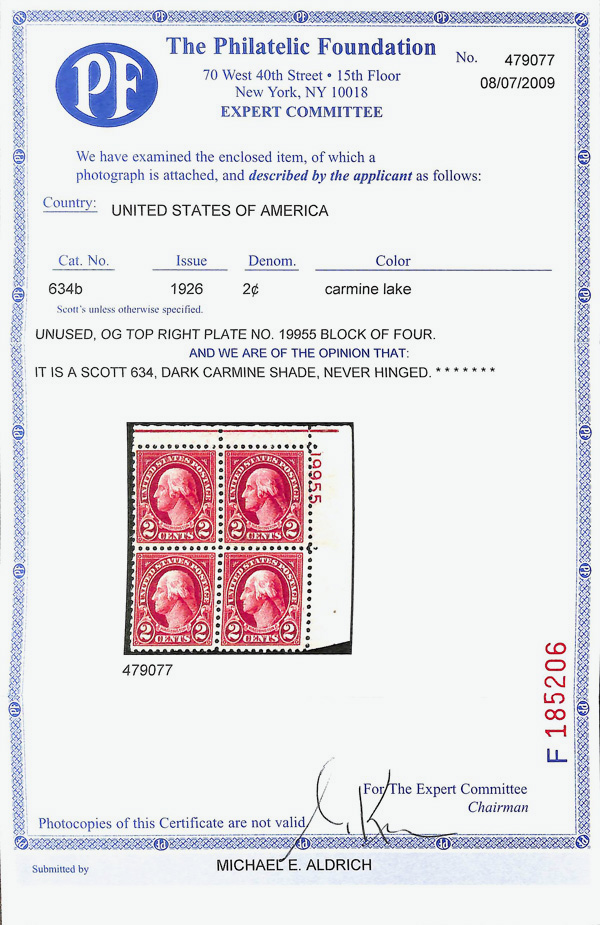 6701 nhbl 634 image1926, 2¢ Washington Dark Carmine Shade, type I, rotary press printing (Scott 634), top right plate number 19955 block of 4, Deeply vibrant printed sheen, o.g., never hinged, Fine to Very Fine, with 2009 P.F. certificate. (Image) (Image2) (All Images)