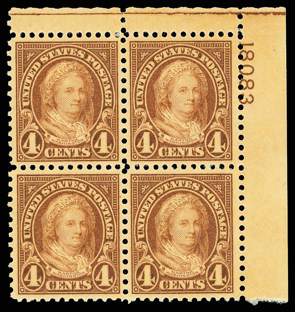 6702 nhbl 636 image1927, 4¢ Martha Washington, rotary press printing (Scott 636), top right plate number 18083 block of 4, Fresh clarity across the design, o.g., never hinged, Very Fine.