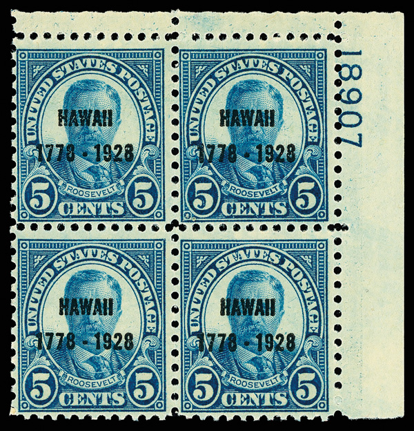 6706 nhbl 648 image1928, 5¢ Hawaii (Scott 648), top right plate block of 4 with plate number 18907, Bright, lively color that really pops, o.g., never hinged, Fine.