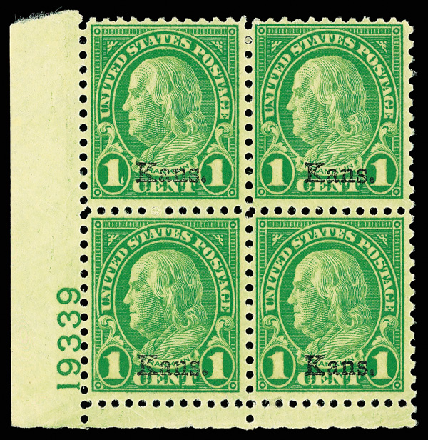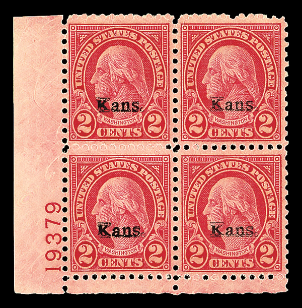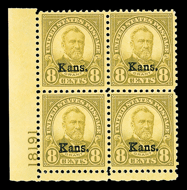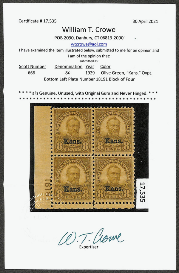 6716 nhbl 666 image1929, 8¢ Kans. (Scott 666), bottom left plate block of 4 with plate number 18191, Impressively fresh shade, o.g., never hinged, Fine to Very Fine, with 2021 Crowe certificate.